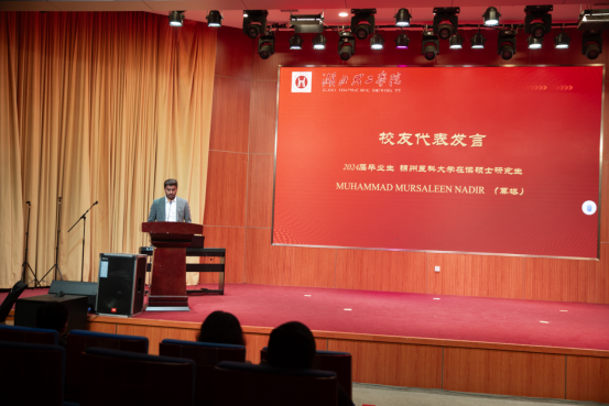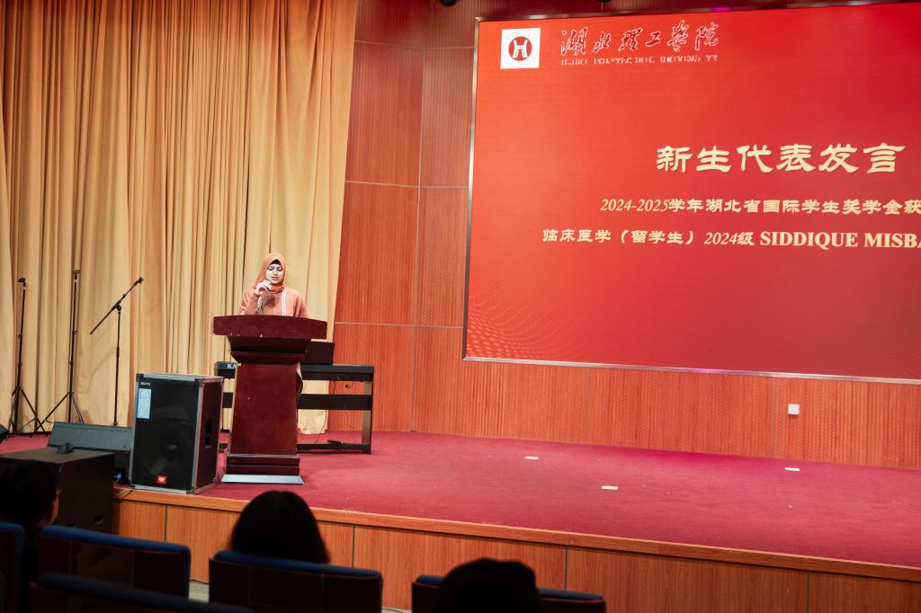 新生代表2024-2025学年湖北省国际学生奖学金获得者,来自巴基斯坦的2024级临床医学专业留学生SIDDIQUE MISBAH发言,她表达了对湖北省政府、学校、老师的感激之情,承诺一定不负湖北省政府、学校和老师的期望,做好学业规划,努力学习专业知识、汉语和中国文化,做中国和巴基斯坦友谊的使者。在校生代表学生会主席2023级临床医学留学生 MUHAMMAD SAMAR ASIF介绍了在我校学习期间取得的成绩、学生会工作计划以及对全体留学生的希望。校友代表锦州医科大学硕士研究生,2024届毕业生MUHAMMAD MURSALEEN NADIR分享了他在我校学习的经历,对学校领导、老师的关心、教导、支持表示感谢,鼓励学弟学妹努力成为优秀的医学人才。