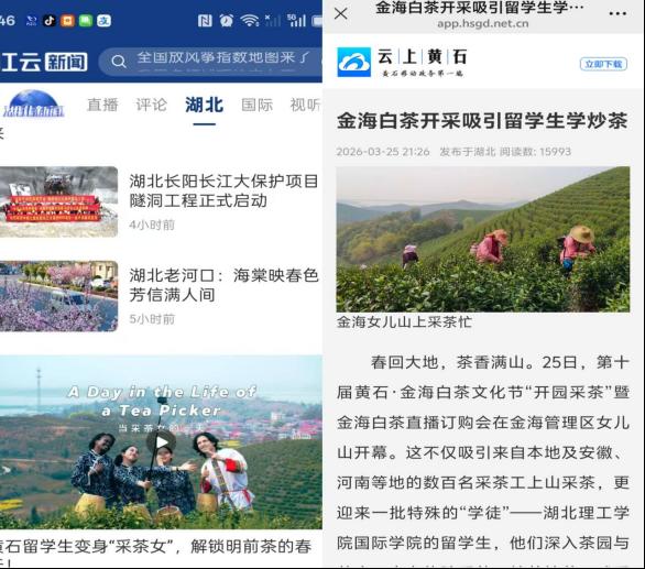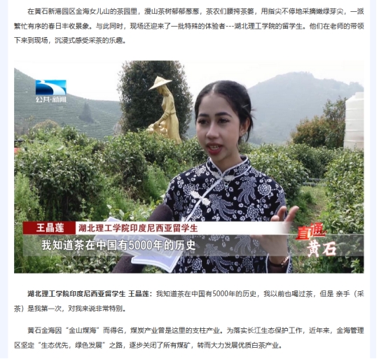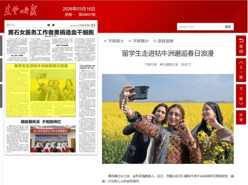 近日,我校组织留学生开展了“读懂中国·魅力黄石”系列文化体验及社会实践活动。从西塞山河口镇漫山遍野的金色油菜花海,到阳新县金海万亩茶园里沁人心脾的茶香,留学生们以“文化使者”的独特视角,用眼睛观察、用双手触摸、用心灵感受,生动地展现出黄石在乡村振兴、文化传承与城市发展中的崭新面貌。此次活动先后获得学习强国、湖北电视台、黄石日报、东楚晚报等多家主流媒体报道,相关图文报道及视频同步发布在海外社交媒体“Discover Huangshi”外宣版块,实现海内外双线传播,引发广泛社会关注与热烈反响。