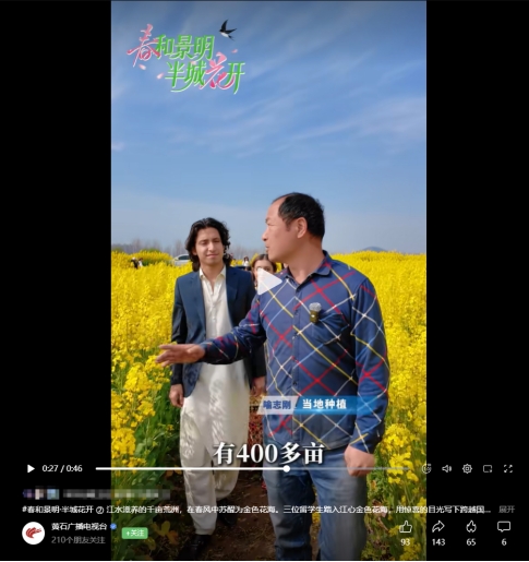 在当地种植户喻志刚的娓娓讲述中,留学生们逐渐了解到,自2015年起,当地依托政策引导、技术扶持和土地流转,一步步将牯牛洲的撂荒地,改造为连片丰产的油菜田——既牢牢守住了耕地红线,又让村民们的腰包渐渐鼓了起来,走出了一条生态与增收双赢的道路。来自巴基斯坦的留学生娜娜望着眼前的花海,动情地说:“我的家乡也有油菜花,但从来没有见过这么壮观的景象。这里不仅是土地重获新生的地方,更让我真切看到了乡村振兴的力量。”留学生李华驻足花海间,感慨不已:“从杂草丛生的荒地,到满眼金黄的花海,这简直就是一场土地修复的奇迹。”留学生韩立斯则对这种“守好耕地、打造美景、兴旺产业”的模式赞不绝口:“这种做法特别务实,真正惠及了老百姓,值得推广学习。”留学生们用异国青年的视角,让藏在花海中的耕地保护智慧、乡村振兴成果,被更多人看见、点赞。