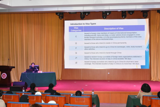 市公安局出入境管理支队政务服务大队大队长程蕾,围绕《中华人民共和国出境入境管理法》核心条款、来华签证与居留许可类别、在华合法合规学习生活指引等方面开展宣讲。程蕾警官全面解读了出入境管理相关法律法规,重点讲解了签证与居留许可办理及延期、临时住宿登记、证件保管与遗失补办等业务的办理流程,明确界定了“非法入境、非法居留、非法就业”三类违法行为的法律后果。同时,结合涉外诈骗、非法就业等涉留学生典型案例,详细告知了出入境业务咨询、应急求助的官方渠道,确保留学生遇有困难时能够第一时间获得专业帮助与指引。