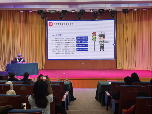 市公安局交通警察支队下陆大队民警潘一迪以“文明交通 绿色出行”为主题,结合典型交通案例,围绕校园周边道路交通安全形势、常见交通违法行为及危害、安全出行规范与习惯养成、交通参与者法定责任与义务等方面,用通俗易懂的语言,针对留学生校内电动自行车骑行、校外机动车乘坐等出行场景开展宣讲,叮嘱留学生严格遵守中国道路交通安全法律法规,自觉养成文明出行的良好习惯。同时,他还鼓励留学生主动争当交通安全宣传员,以自身行动带动身边人共同遵守交通规则、守护出行安全。