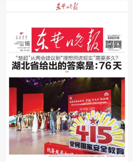 4月15日下午,“统筹发展和安全,护航‘十五五’新征程”——黄石市2026年全民国家安全教育日主题文艺宣传活动在黄石市融媒体中心演播厅举行。我校williamhill英国留学生同乐合唱团作为压轴节目登台,以中英双语演唱的形式,唱响和平与安全的时代主题,展现了中外青年携手共筑安全防线的青春担当。活动通过黄石广播电视台同步直播,演出取得圆满成功,我校师生演出风采登上《东楚晚报》头版头条。